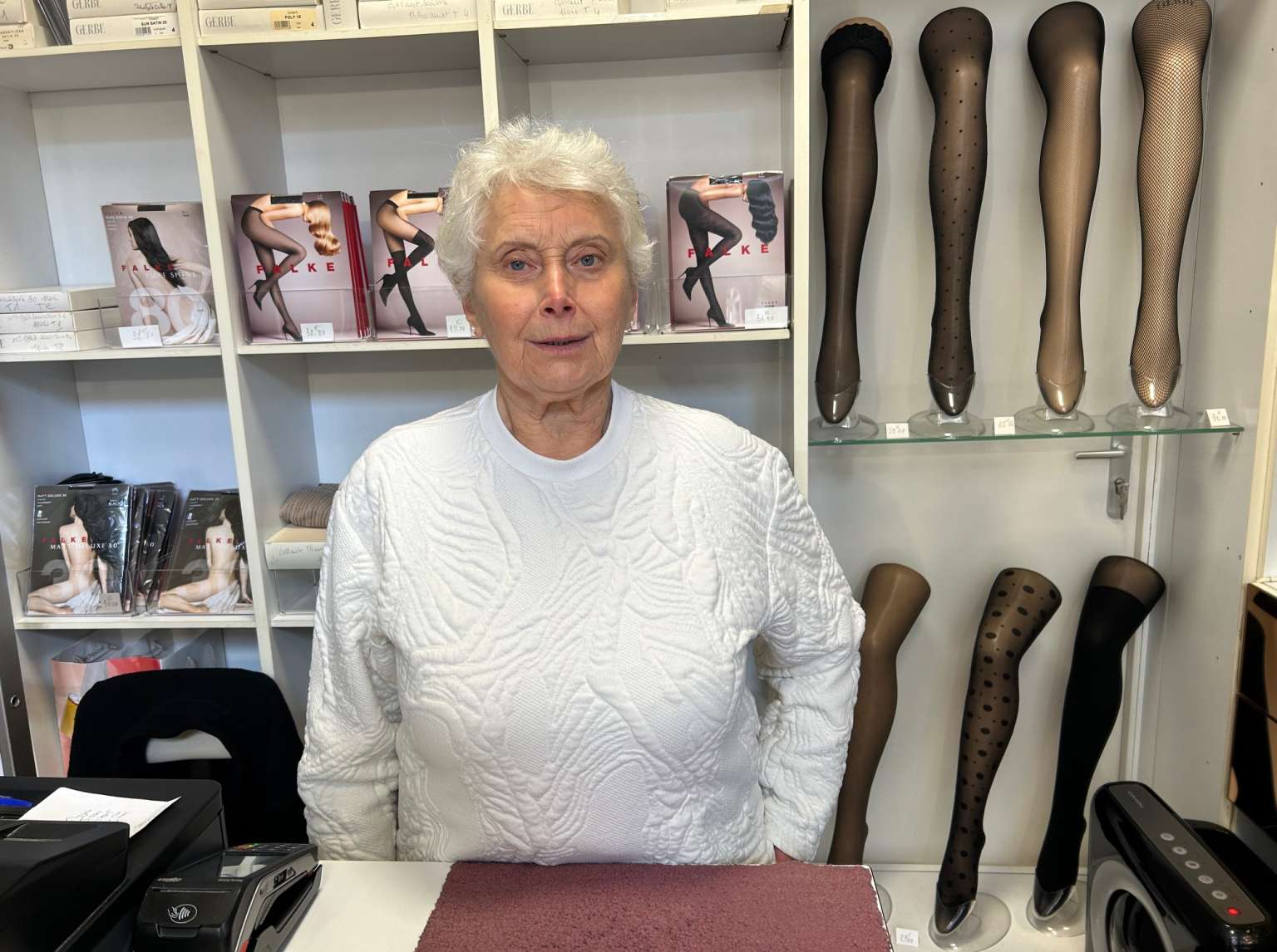 Puis arrivent les années plus difficiles. Dior, Yves Saint Laurent, Céline se font moins productifs. « Une partie de mes clientes préféraient alors monter à Paris, à la recherche des belles boutiques et de l’élégance à la française », commente la vendeuse. Coup de grâce avec le Covid, quand la maison Gerbe annonce stopper sa production. « Je ne me suis pas démontée. Je leur ai acheté une bonne partie de leur stock avant qu’ils ne mettent la clé sous la porte. J’étais une de leurs meilleures revendeuses du pays ! », raconte Yolande Jouanny qui s’est alors tournée vers Falke, fabricant allemand, pour garnir ses présentoirs.
