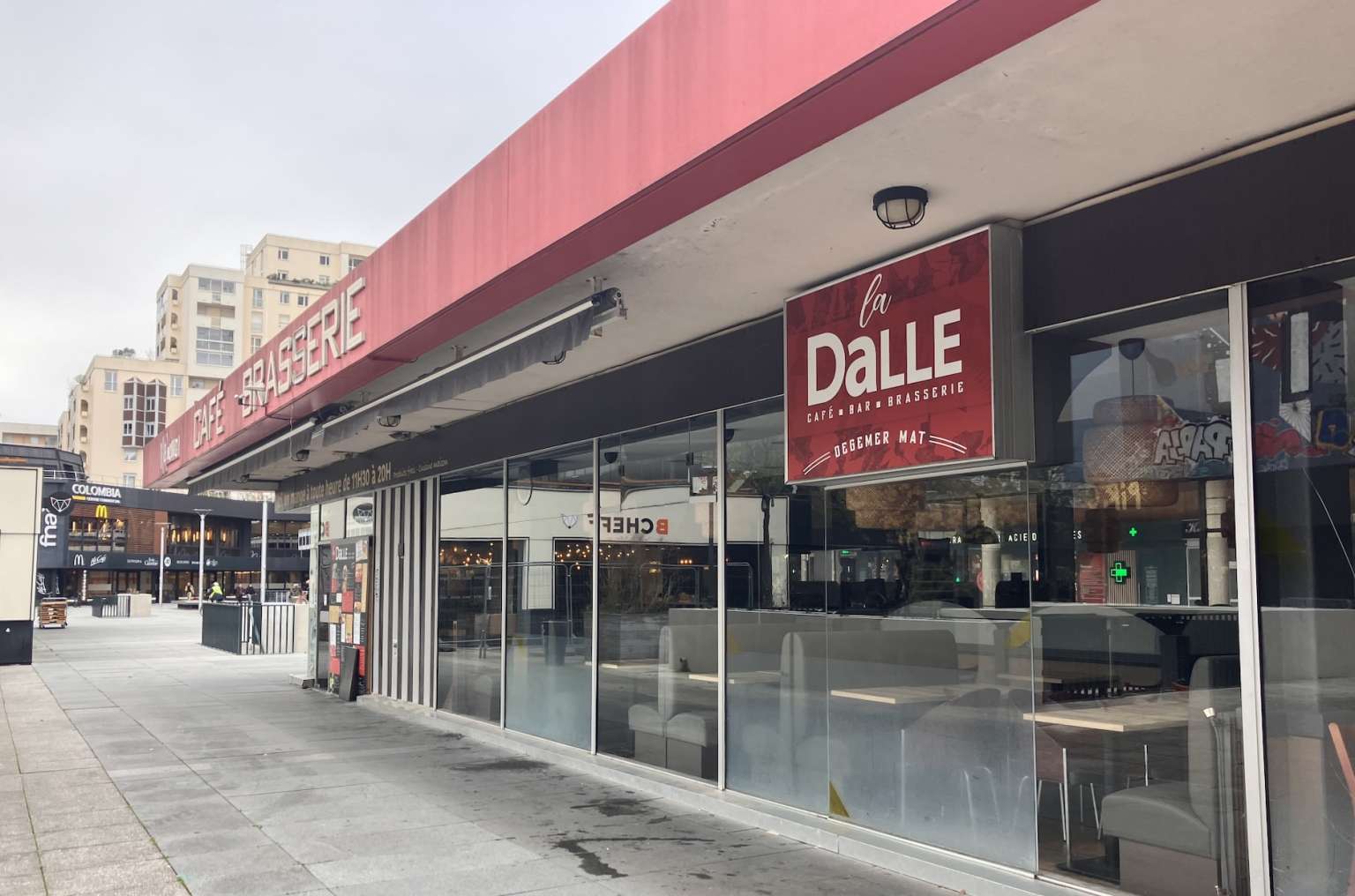 Le nom La Dalle vient de son emplacement, sur la dalle du Colombier, un vaste plateau piéton du centre de Rennes construit dans les années 1970, lors de la modernisation du quartier. Le lieu a toujours eu une vocation commerciale et de restauration. Il était fréquenté par les employés des bureaux voisins, les habitants et les passants entre la gare et la place de la République. Dans les années 2000-2010, le site a été repris et transformé en brasserie contemporaine, sous le nom La Dalle. On y servait une cuisine simple — burgers, salades, plats du jour — avec boissons et service continu. « C’était devenu un spot de pause déjeuner ou d’afterwork, fréquenté par les salariés du Colombier, les étudiants et les voyageurs de la gare (à cinq minutes à pied) », se souvient une habituée. Tout autour, l’opticien, le coiffeur, le restaurant et d’autres commerces poursuivent leurs activités. « Il faut venir nous voir ! », lance une commerçante du quartier.